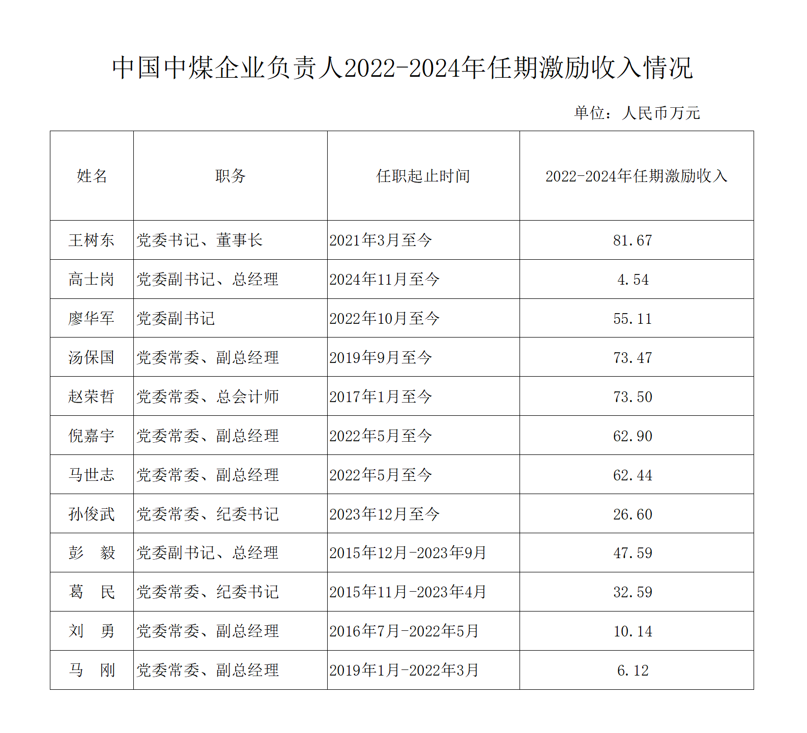 中國中煤企業負責人2022-2024年任期激勵收入情況