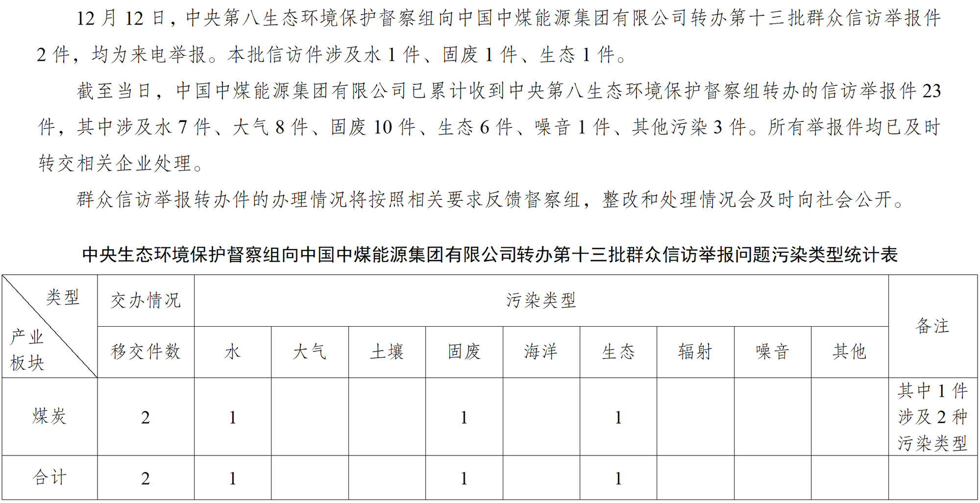 中央第八生態環境保護督察組向中國中煤能源集團有限公司轉辦第十三批群眾信訪舉報件